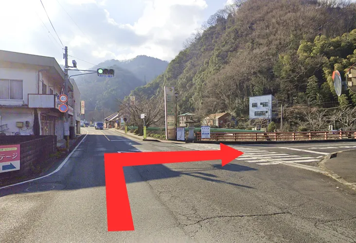 4. 50mほど進んだ先のY字路を右折して橋を渡ってください。その後ふじかわ牧場の看板前を右折してください。