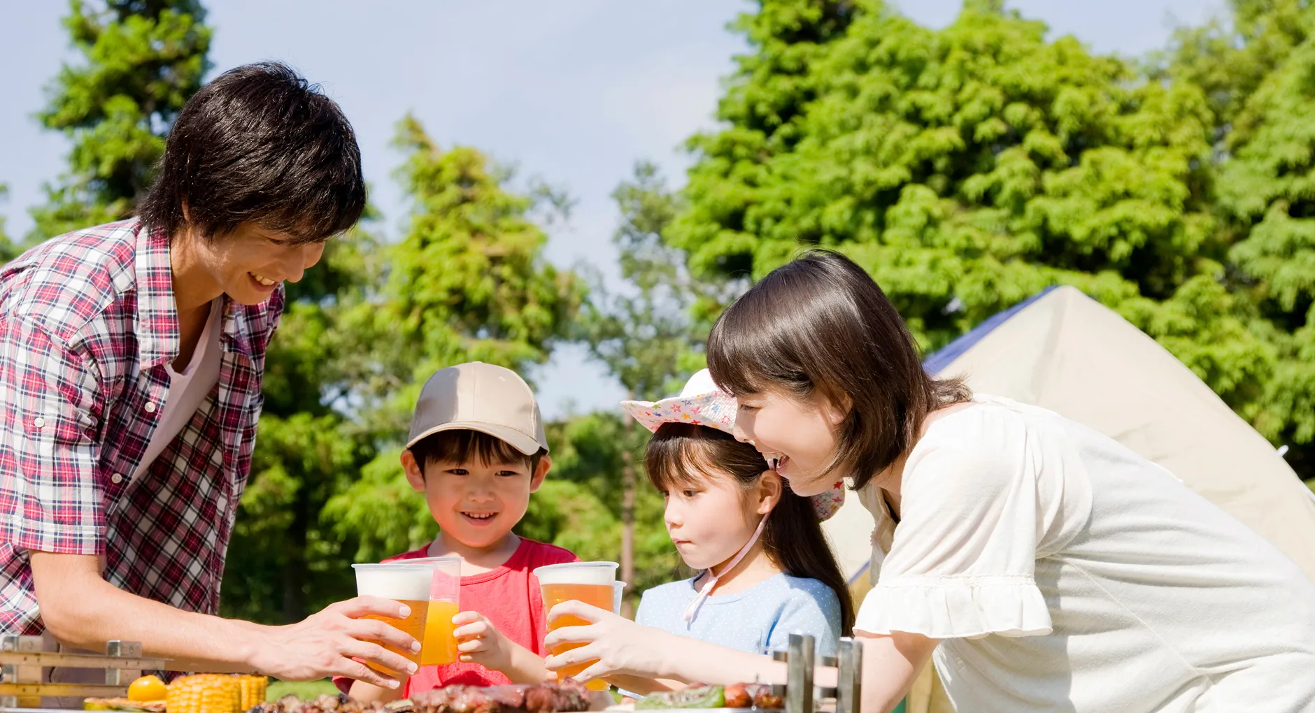 湖畔の美しい景色を眺めながら、家族一緒にオープンテラスで炭焼きバーベキュー。新鮮な食材を囲みながら、家族みんなで素敵なひとときを。
